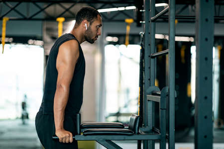 Muscular african american man doing parallel bar dips triceps exercise at gym