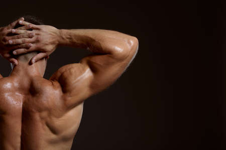 Back view of the sexy muscular bodybuilder s back and hands on the black background of studio