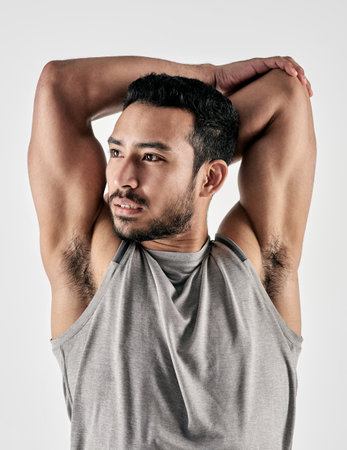 Sweat and sacrifice builds strength. Studio shot of a muscular young man stretching his arms against a white background.