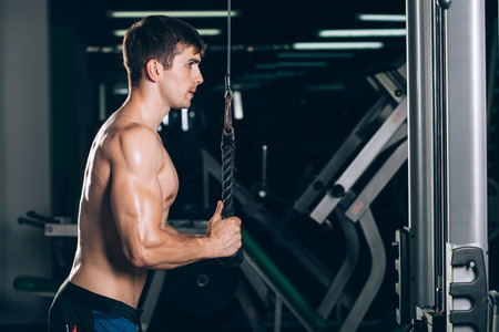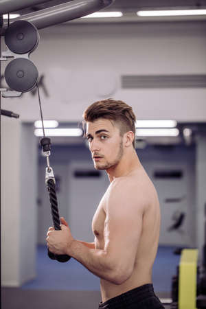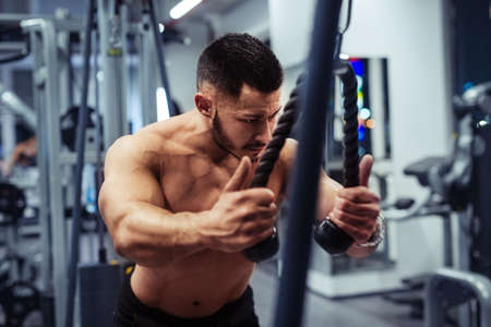 Naked torso muscular man working out in gym doing exercises with triceps rope