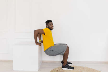 Full length view young handsome strong fit Afro American male in yellow sportswear deeply squatting indoors at home or studio. Healthy millennial man trainer recording video sport lesson at home.