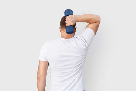 Young man with white t-shirt exercises with dumbbell against grey wall. High quality photo