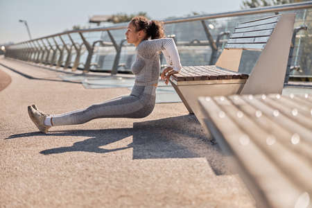 Sporty woman doing triceps dip exercise on the bench outdoor