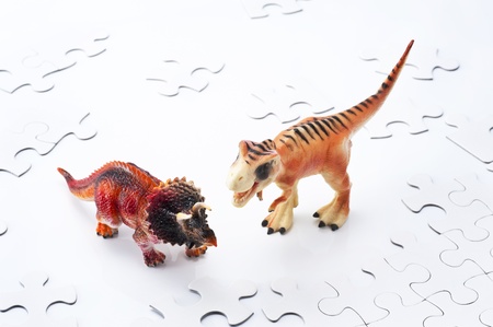 Dinosaur toy and jigsaw puzzle on white background