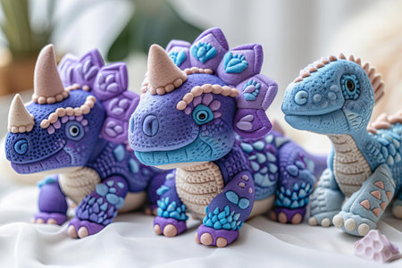 Colorful plastic dinosaur toys are arranged playfully on a bright white background, highlighting their vibrant colors and inviting imaginative play