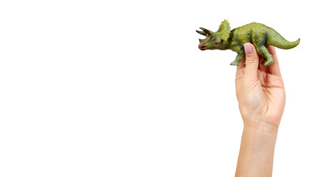 Green rubber dinosaur toy with hand, prehistoric wild animal. Isolated on white background. Copy space.