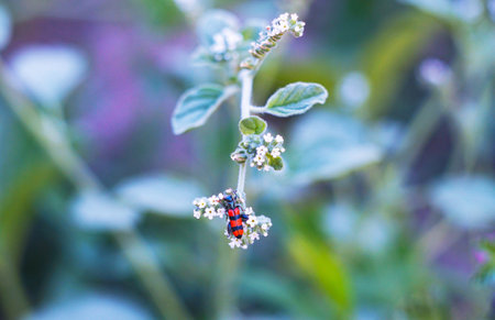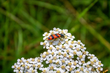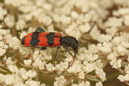 Closeup on the colorful red bee wolf parasite beetle, Trichodes apiarius feeding on a white wild carrot flower, Daucus carota in Southern France