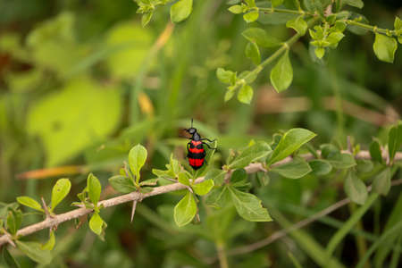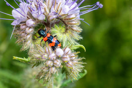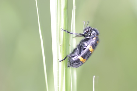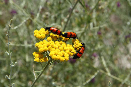 Natural vertical closeup on a colorful orange and black blister beetle, Mylabris variabilis, a parasite on solitary bees in Southern France
