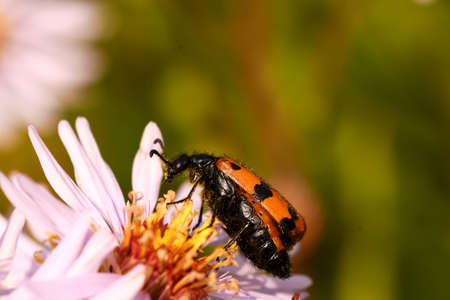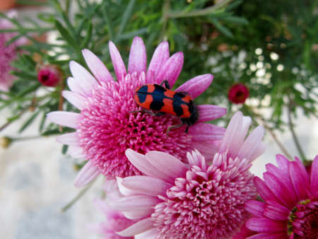 specimen of beetle Trichodes alvearius on pink chrysanthemum flowers