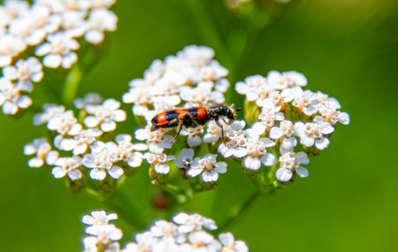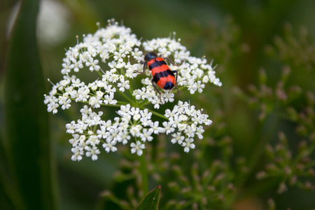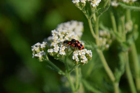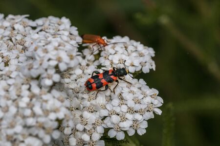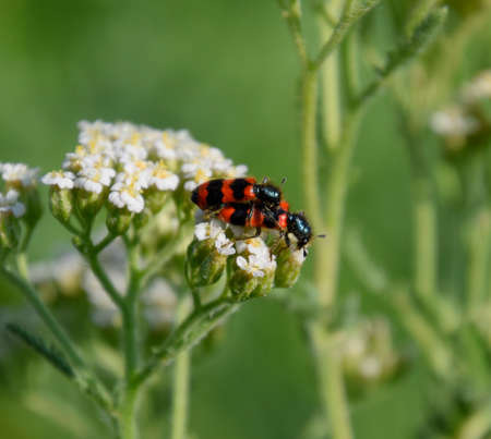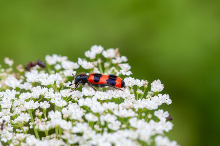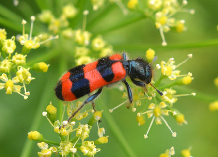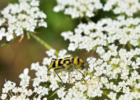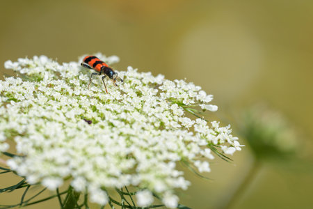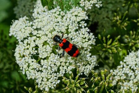 On a flowering medicinal plant carrot sits a bright beetle with red stripes common bee beetle] (lat. Trichodes apiarius).