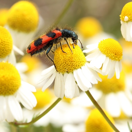 Closeup of a checkered beetle (Trichodes apiarius) on white flowers