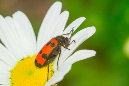 Beetle Leptura rubra on a daisy flower. Macro shot.