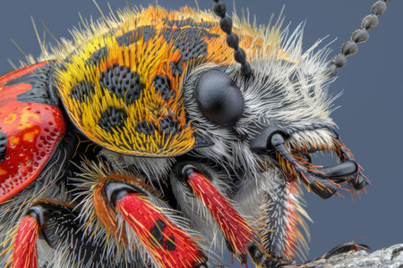 A detailed close-up image showing a vibrant and hairy insect with striking red, yellow, and black patterns, including long red antennae, set against a dark backdrop.
