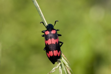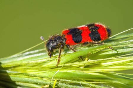 Detailed closeup on the colorful red bee-eating hairy beetle, Trichodes alvearius
