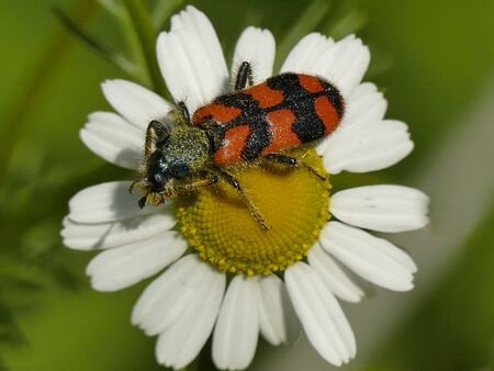 Colorful checkered beetle (Trichodes apiarius, Cleridae) sitting in a flower