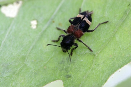 (Trichodes quadriguttatus), mottled beetle on a thistle leaf
