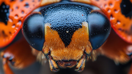 A striking orange and black beetle is captured up close, showing its unique markings and fine textures. The focus reveals the fascinating details of its anatomy.