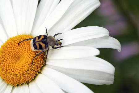 A large beetle is crawling on a petal of a chamomile flower. Macro shooting on a sunny summer day