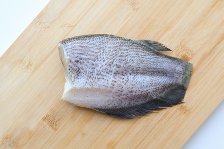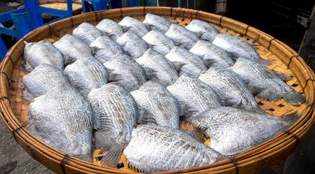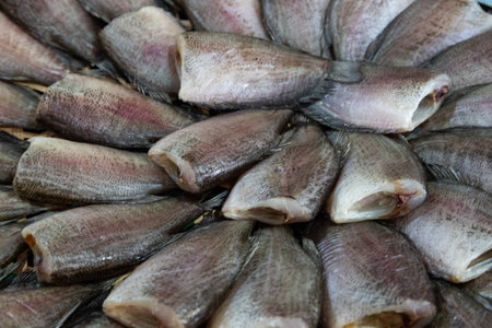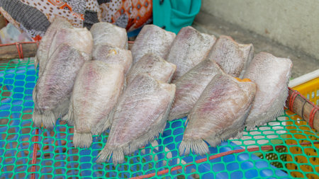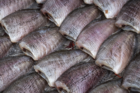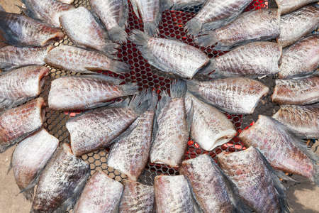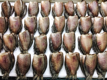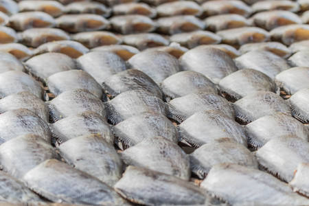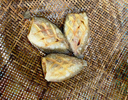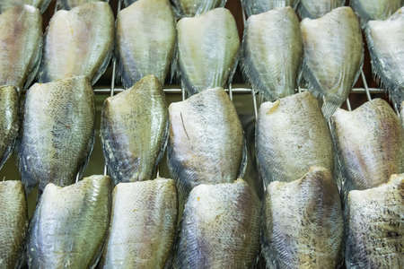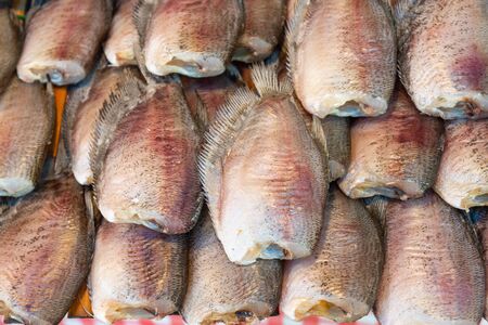Salted fish is a dry food. . Fish marinated in salty sauce and dried in the sun to preserve food ,Thai style.Close up and top view.