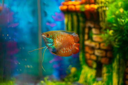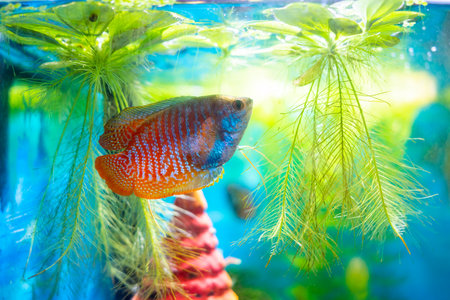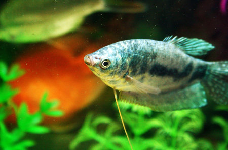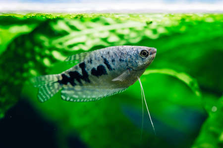 Portrait blue form of fish from genus Trichogaster (Colisa) in aquarium