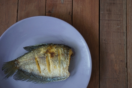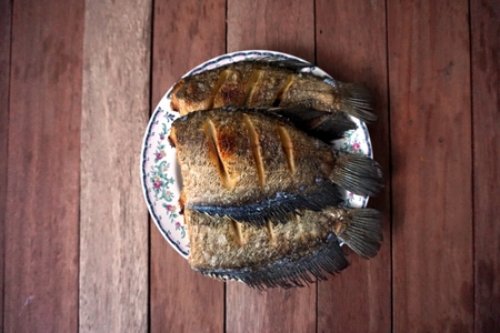Fried dried salted snakeskin gourami fish or Sepat Siam on grille.