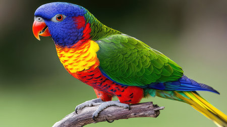 A striking close-up showcases a rainbow lorikeet, its plumage a riot of color. The bird displays vivid hues of red, yellow, blue, and green. The soft, blurred background enhances the focus on the subject, suggesting a natural environment. Suitable for a variety of creative and illustrative projects.