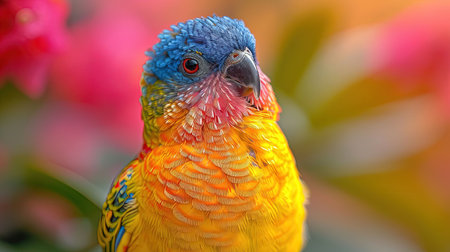 Stunning close-up of a rainbow lorikeet showcasing vibrant plumage and expressive eyes. This exotic bird captivates with its colorful feathers in a natural setting.