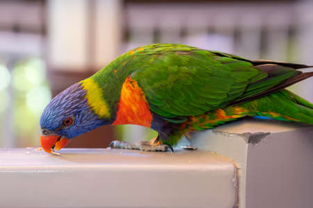 Bright and colorful lorikeet (Lorinae) sitting on a wooden pole