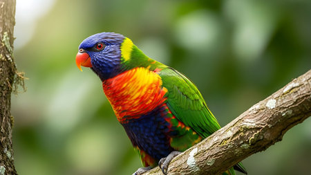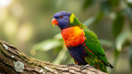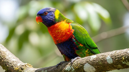 A striking close-up showcases a rainbow lorikeet, its plumage a riot of color. The bird displays vivid hues of red, yellow, blue, and green. The soft, blurred background enhances the focus on the subject, suggesting a natural environment. Suitable for a variety of creative and illustrative projects.