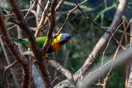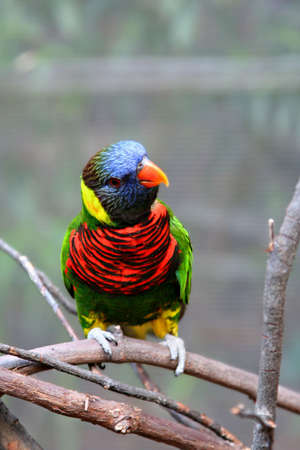 Portrait of a small colorful parrot sitting on a branch. Tropical bird, lory family. Red, blue, yellow and green colors. Close up view of the animal with a blur background. Multicolored feathers. avifauna, netherlands