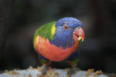 One lorikeet parrot feeding from bowl in zoo and looking in camera. Beautiful wild tropical animal bird eating nectar. Beauty of wildlife nature.