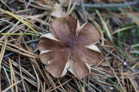 Top view of a gray mushroom growing in the forest in autumn