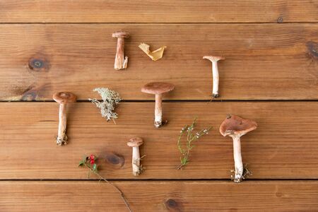 Fresh mushrooms picked from the forest on wooden background