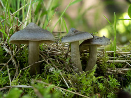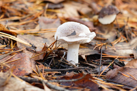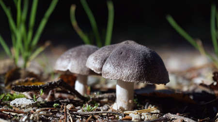 The gray mushroom grows in a clearing in the autumn in the forest