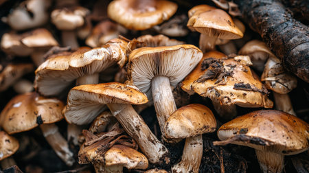 Honey mushrooms lying on forest ground among leaves and moss