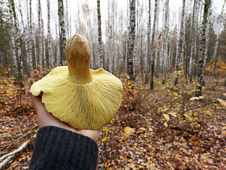 One plate mushroom in his hand against the background of the autumn forest. Trees without leaves, cloudy day, yellow leaves on the ground. The joy of finding a huge edible mushroom. Look for and find mushrooms. Quiet hunting, outdoor recreation.