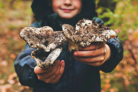 Childs hands are holding mushrooms. Looking for mushrooms in the forest. Kid hands hold large mushrooms in the forest in autumn. Forest mushroom picking season.