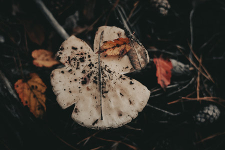 Close-up of a white wild mushroom contrasting sharply against the dark forest background. Macro photography captures the intricate details of the mushroom in its natural habitat. Autumn season nature.