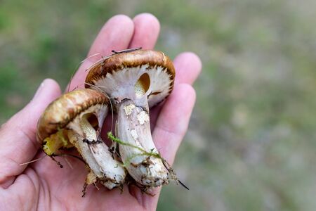 Tasty Suillus Gray on a man's hand. Mushroom picker with found plump mushrooms. Summer season.