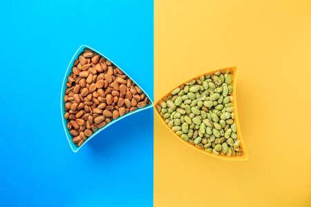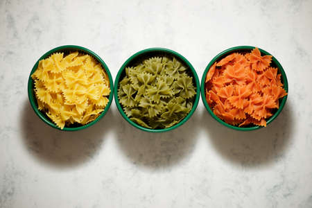 Shell noodles in 5 colors and flavors. Raw whole grain pasta on a white background, made with durum flour, rich in nutrients: protein, carbohydrates and fiber