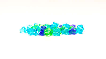 Pile of assortment light green, blue, pink aqua jewels or aqua solitaire made of polystyrene decorative isolated on white background. Terrarium deco or fish aquarium accessories jewels stone