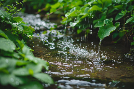 Closeup of raindrops hitting the serene water of a forest stream surrounded by lush greenery