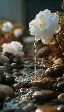 A close-up captures water cascading from a white flower, creating a visual flow over smooth, rounded stones. The composition uses natural light and selective focus, emphasizing the texture of the flower petals and the wet stones. This image could be suitable for articles related to nature, wellness, or design.