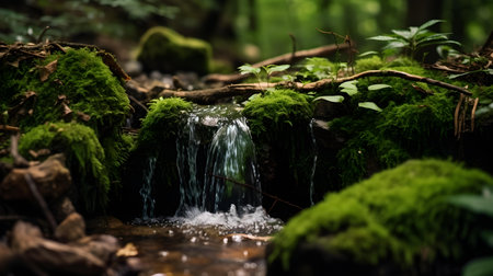 Top view of stream of clean spring water. Transparent stream, bubbles, green wet moss.