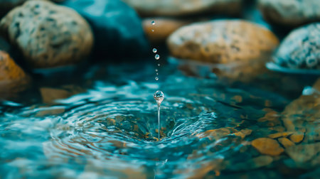 A captivating close-up image showcasing a blue liquid droplet dripping from a textured rock surface, surrounded by reflective water. Perfect for nature and abstract themes.