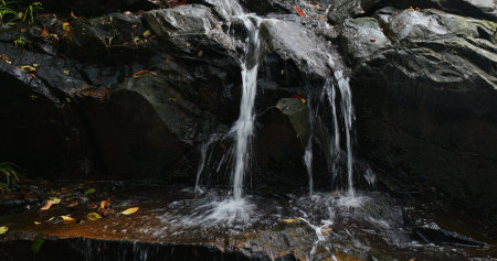 A small stream of water is falling from a rock. The water is clear and calm, and the rock is large and jagged. The scene is peaceful and serene, with the water creating a soothing sound as it falls