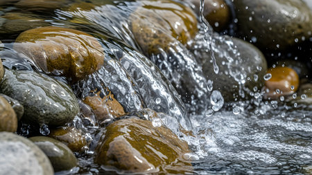 A stunning close-up view of water flowing over smooth rocks, creating enchanting splashes and glistening droplets, showcasing the beauty of nature in a serene environment.