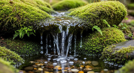 Natural close-up of water falling over mossy stones, calm and peaceful scene