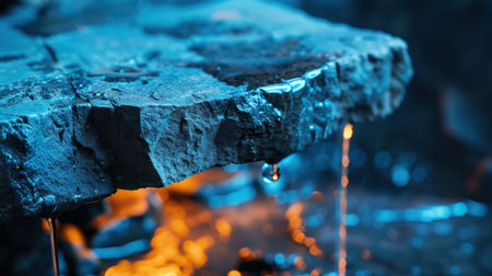 This captivating image showcases water droplets gently falling from a rugged rock surface, surrounded by a unique blue and orange ambiance that enhances its natural beauty.