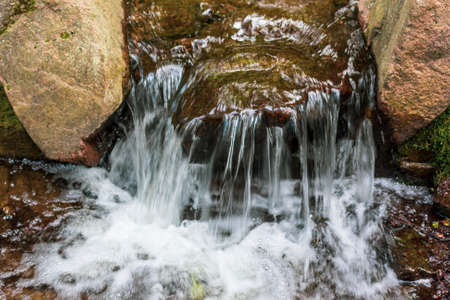 Small waterfall in the forest. Mountain river with clear water and rocks.